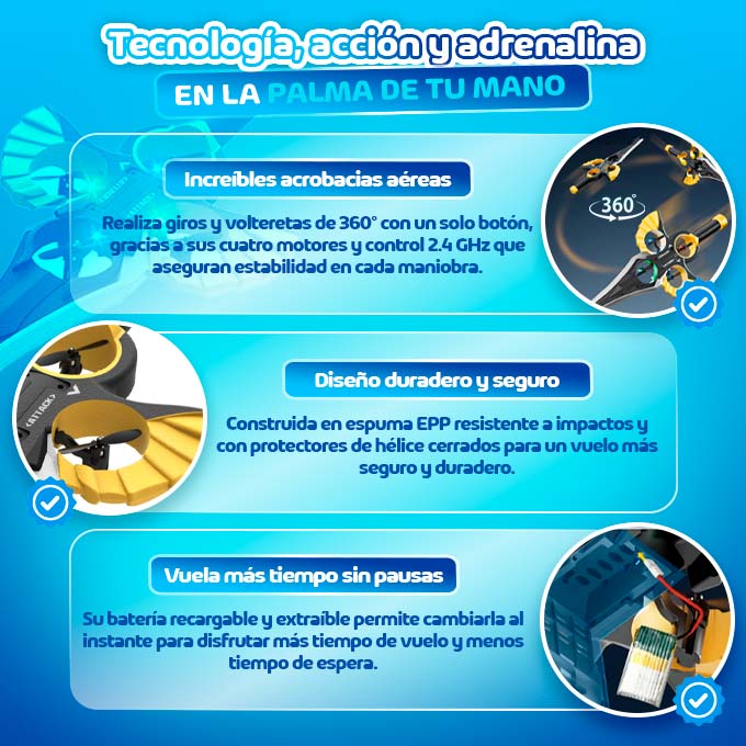 Vuelo estable, luces LED, resistente a golpes y fácil de controlar.